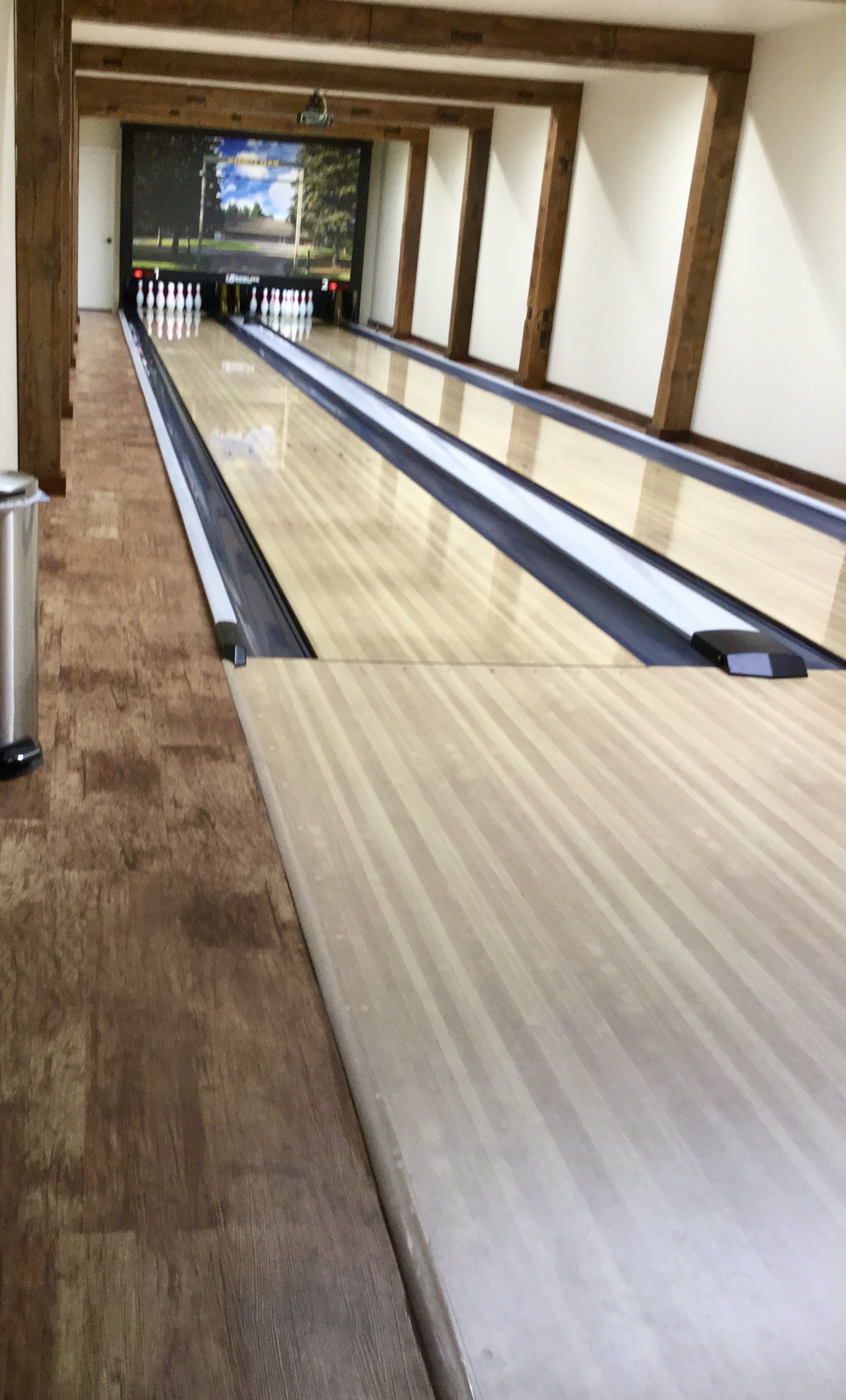 This whole obsession really took off after a half-joke I made years ago -- that I'd happily go on vacation if someone could find me a place in the middle of nowhere in the woods with a bowling alley in the basement. So I Googled it myself, and stumbled on a brand-new Michigan vacation rental called The Lanes at Meemo's Farm. A week later we were there, I think as their very first guests. Everything was immaculate and over the top: 75" TVs in every room, wood-look tile throughout, a hot tub, a workout room, sound systems, a real kitchen, ATVs included for the week, and a kegerator parked right next to the lanes in the basement. All of it set on a sprawling, pristine property in the Michigan woods near Evart. We've been back multiple times since, and it's been worth the trip every single time.