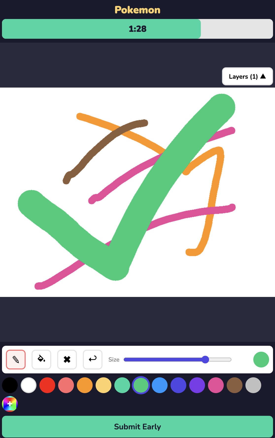 The drawing canvas supports layers, undo, a flood-fill tool, adjustable brush sizes, and a solid color palette. There's an admin panel for managing themes and game config, a gallery page that preserves submitted drawings across deploys, and even a graceful deploy system that drains active rooms before restarting the server so nobody loses their game mid-round.